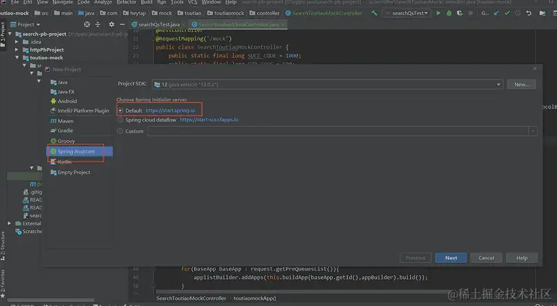 - 导入完成后重启IDEA,在新建项目时会有Spring Assistant展示,选择default