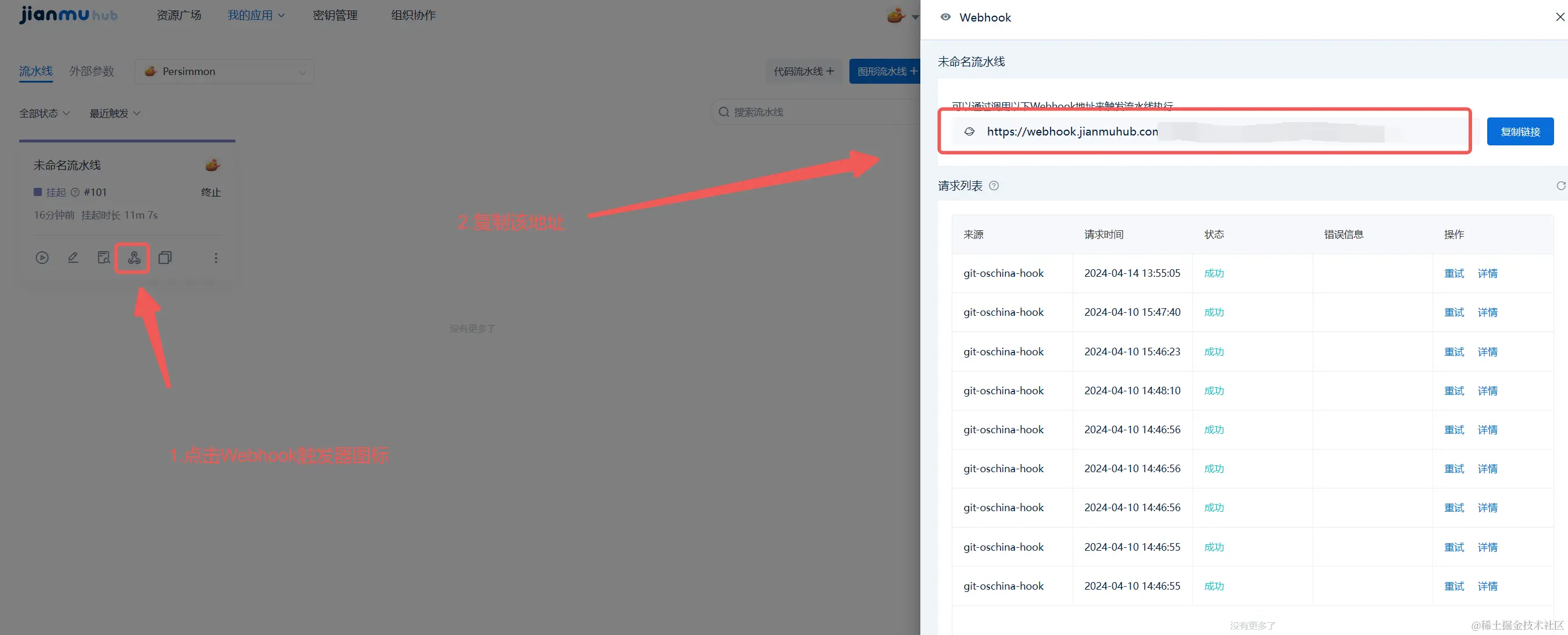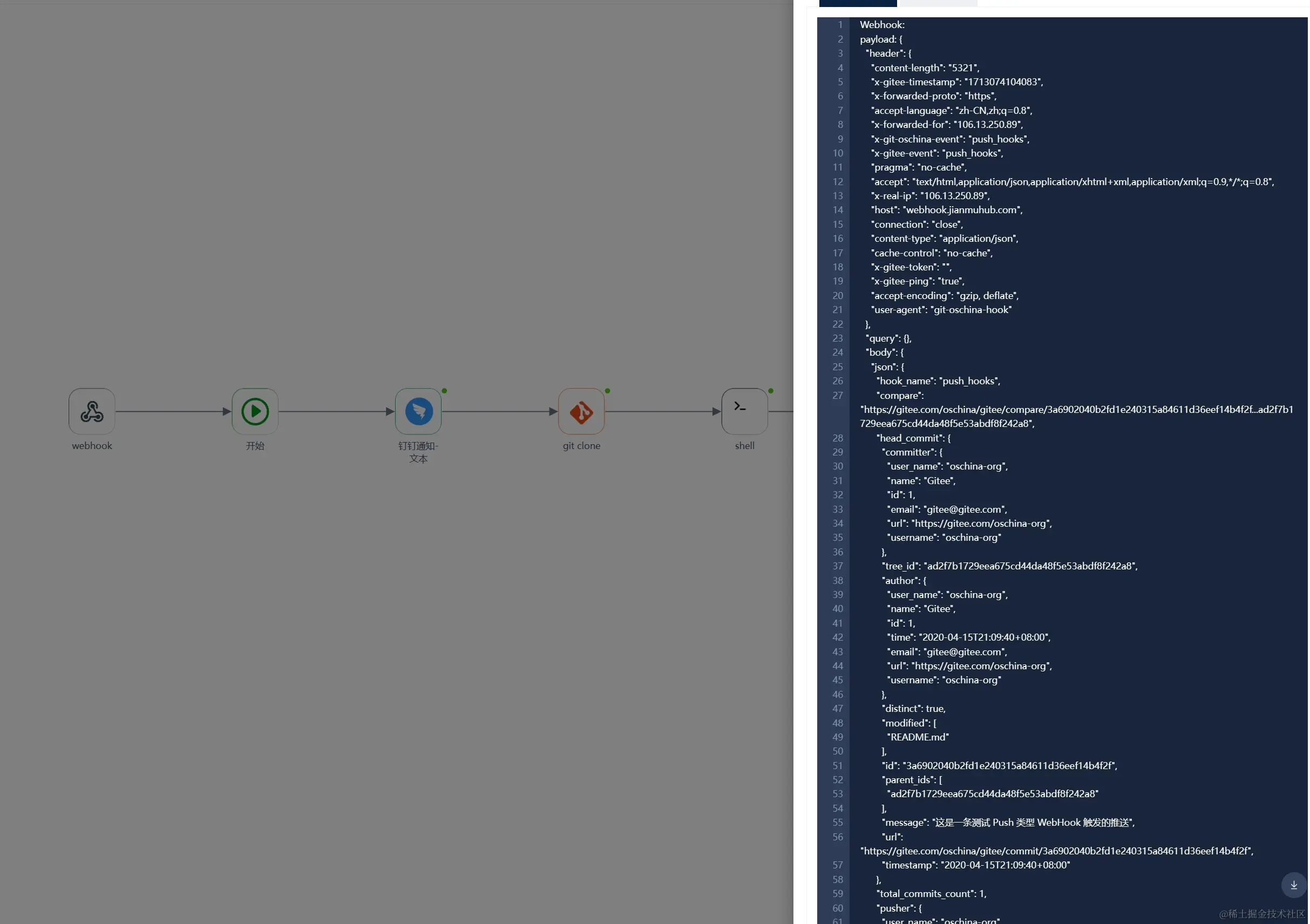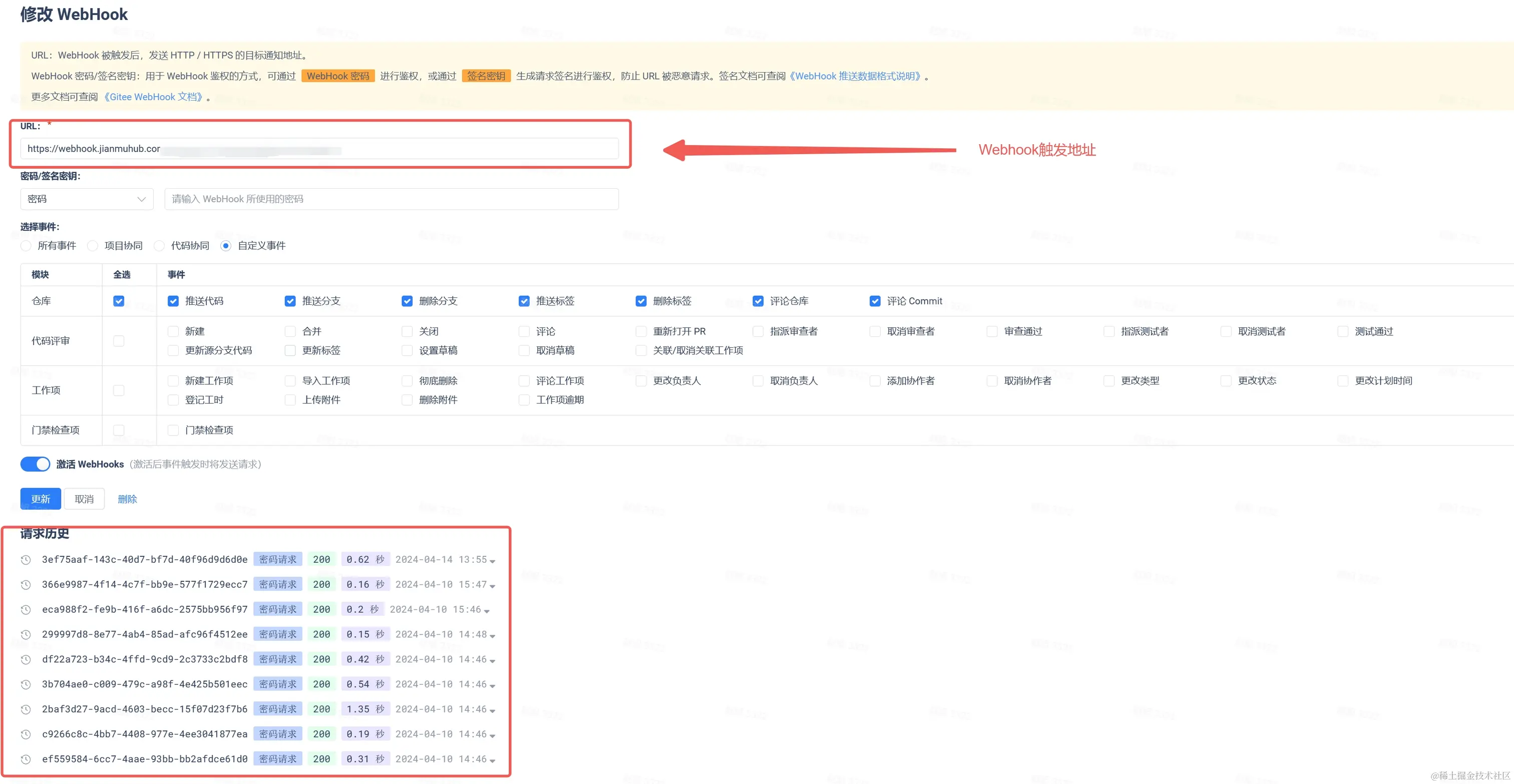 然后在gitee代码仓库中配置Webhook后提交代码可触发流水线。