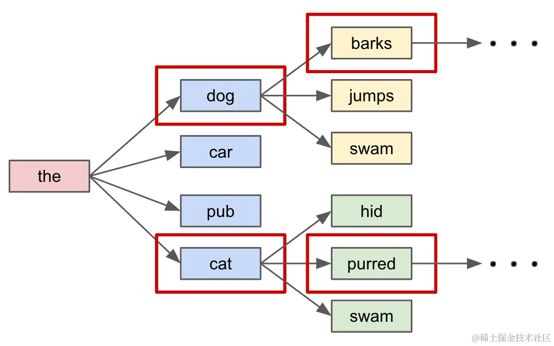 接下来,大模型就开始了漫长的「刷题」之路。随着模型预先初始化时的参数量不同,这个过程耗时几周到几个月不等。完成之后,我们便得到了第一阶段训练的成果——一个具备了超强文本生成能力的基础大模型。我们可以把这个阶段的它认为是一个十分会「接话」的「话唠」,只要给出任意的上文,它都可以进行下一个 token 的预测,配合上面提到的「自回归」方法,理论上我们可以让它一直预测生成下去。加上每次的预测它其实都可以给出多个最可能的 next token,那么如果我们每轮都在多个候选的基础上继续,就可以发散出许多丰富多样的生成结果,下面是一个直观的图示(画图太费劲,这里就偷懒从论文里扒了个英文的图来借用了🤣)。