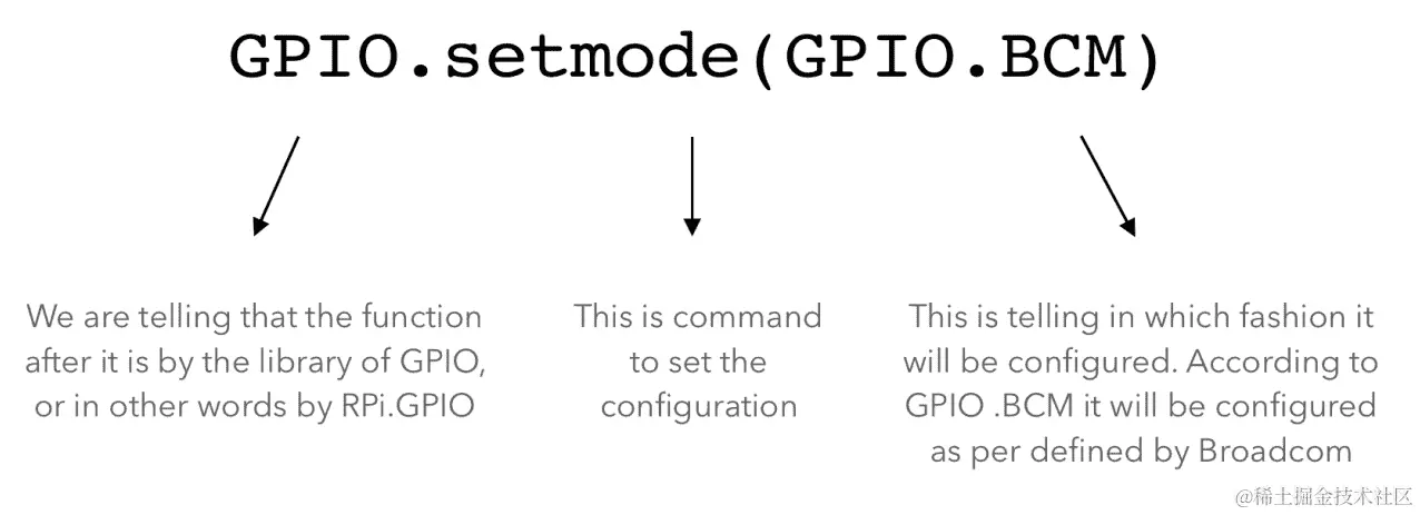 这一行使用了RPi.GPIO库的一个名为setmode的函数。这个函数的作用是将setmode的引脚配置设置为(GPIO.BCM)—BCM是GPIO的一个进一步的函数。
