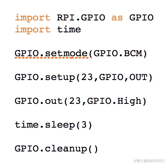 现在,你必须记住的一件事是,我们写的任何代码都将按顺序执行。所以,假设我们把import RPI.GPIO as GPIO放在底部,那么整个程序将无法工作。为什么?因为一旦它到达GPIO.setmode(GPIO.BCM),它将不理解GPIO是什么,也不会理解setmode是什么。因此,我们总是在开始编写代码时导入库。