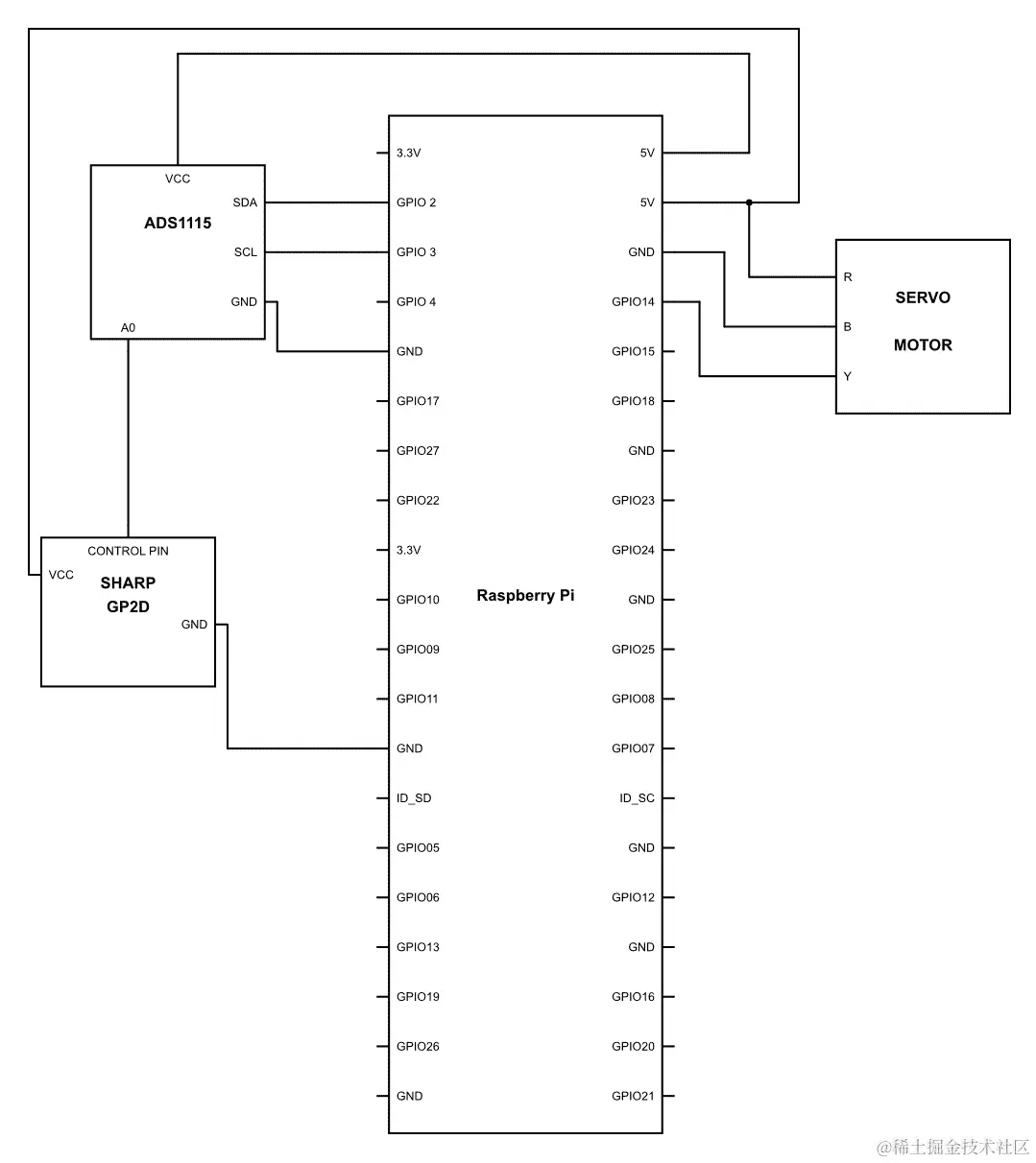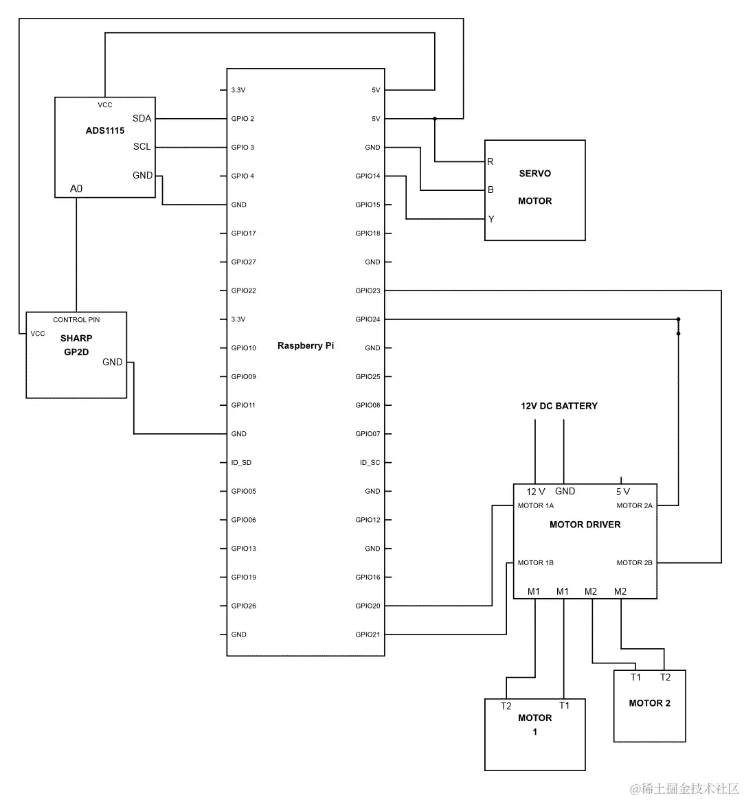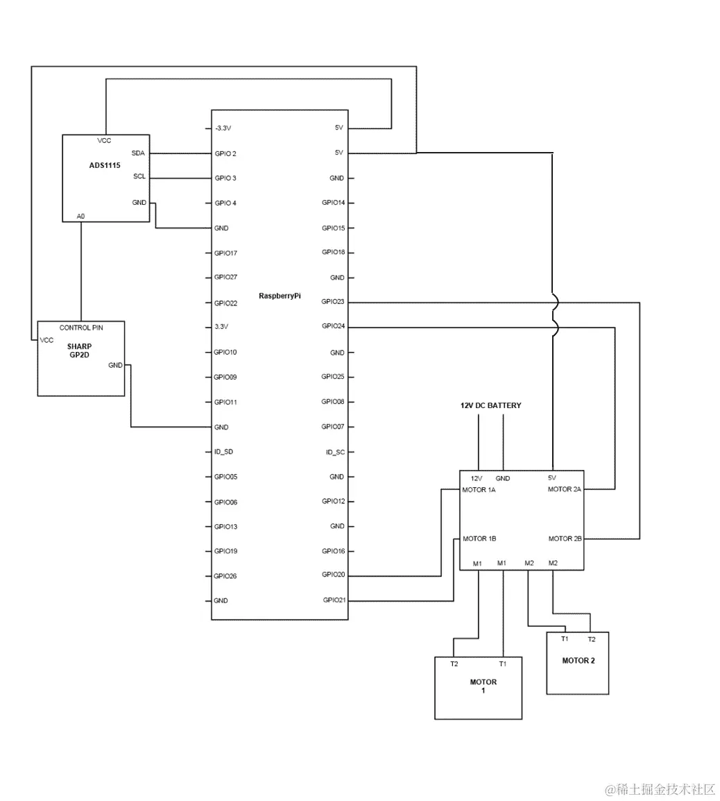 因此,为了制作它,你需要将区域扫描仪安装在车辆上。建议你将其设置在车辆的前端,并确保舵机的臂能够旋转 180 度。你可以使用我们用来固定红外传感器在舵机顶部的类似方法。在做所有这些的时候,尝试使用电缆束带来确保电缆不凌乱,并确保为轴和顶部的传感器的移动留出一些松弛。这些电缆束带可以让你的生活变得非常简单。一旦我们都准备好了,你应该将红外接近传感器使用 ADS1115 连接到树莓派,然后连接电机驱动器,如下图所示: