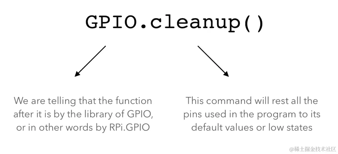 在这一行中,我们使用了来自 time 库的一个函数。sleep 函数基本上会冻结所有 GPIO 引脚的状态。所以,例如,如果引脚23是高电平,那么它将保持高电平,直到执行time函数sleep。在sleep函数中,我们定义了值为3秒。