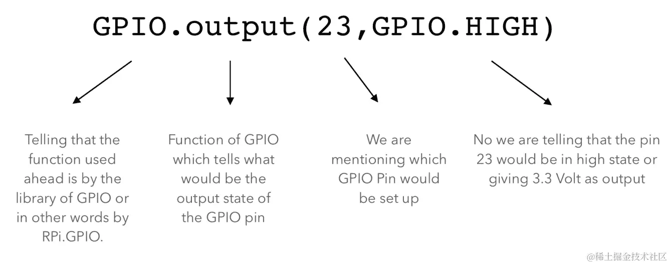 同样,我们使用了 GPIO 库的一个函数output。它的作用是设置板子上特定引脚的状态。所以,这里我们指定了引脚号23必须设置为高电平。只是为了清楚起见,高电平表示开,低电平表示关。