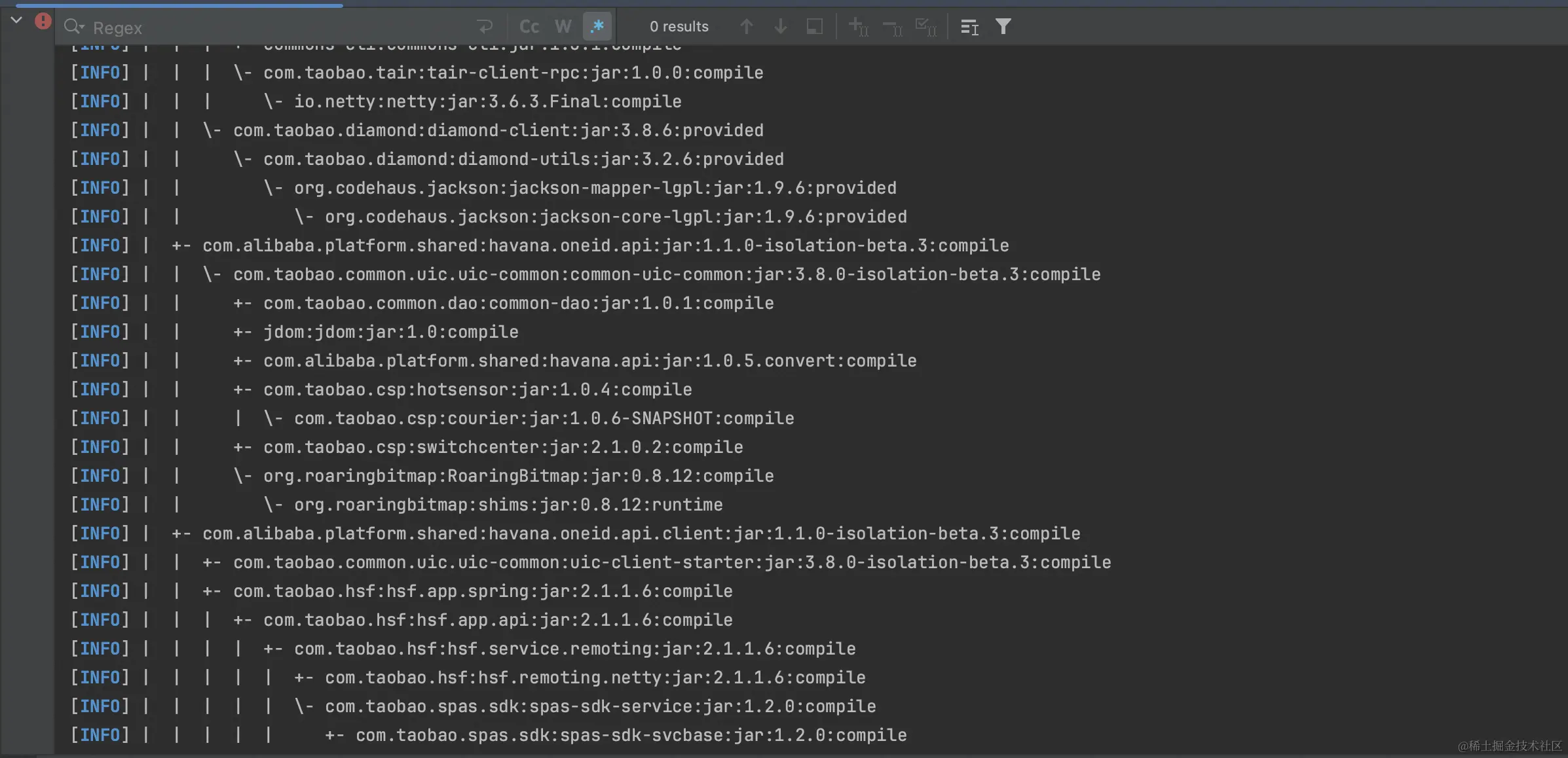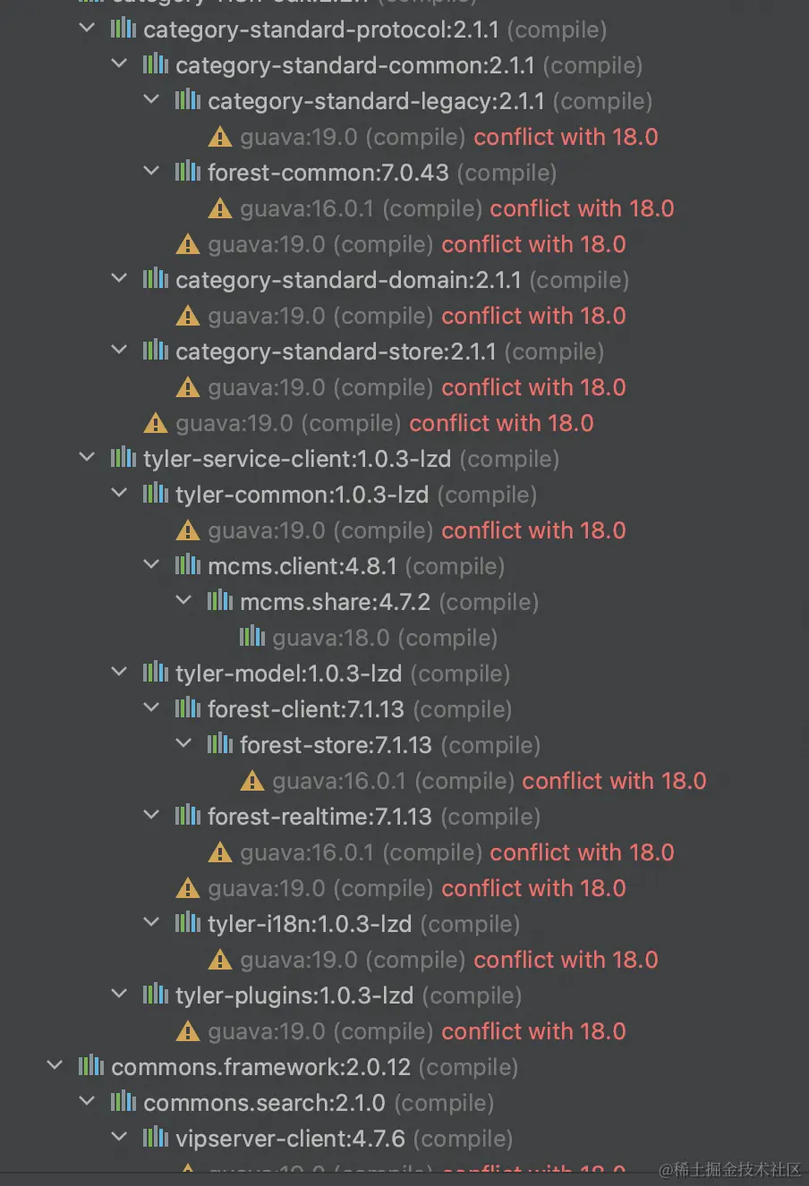 该工具可以显示出二方包下所有的间接依赖,之后我们可以排查哪个依赖与应用中已有的依赖有冲突。