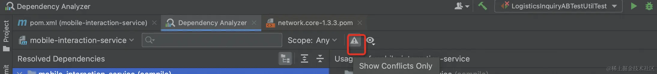 一些时候,尤其是在进行架构升级时,仅通过启动日志直接定位冲突点对于经验不丰富的新手是很困难的,这时我们可以采用一个更简单粗暴的方法,借助IDE工具直接定位二方包会冲突的依赖: