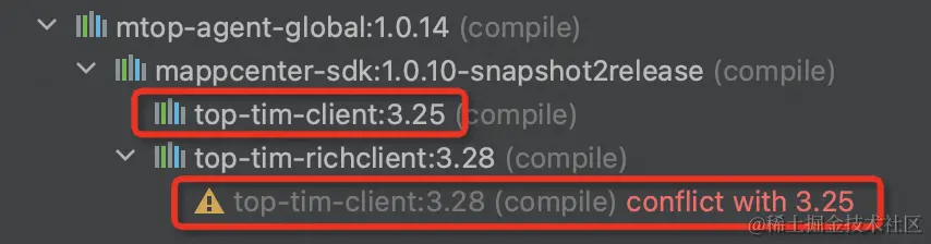 一些二方包可能自己和自己冲突,如果项目的其他位置并没有引入同名包的话,这种包是不能排除的(也不用排除):