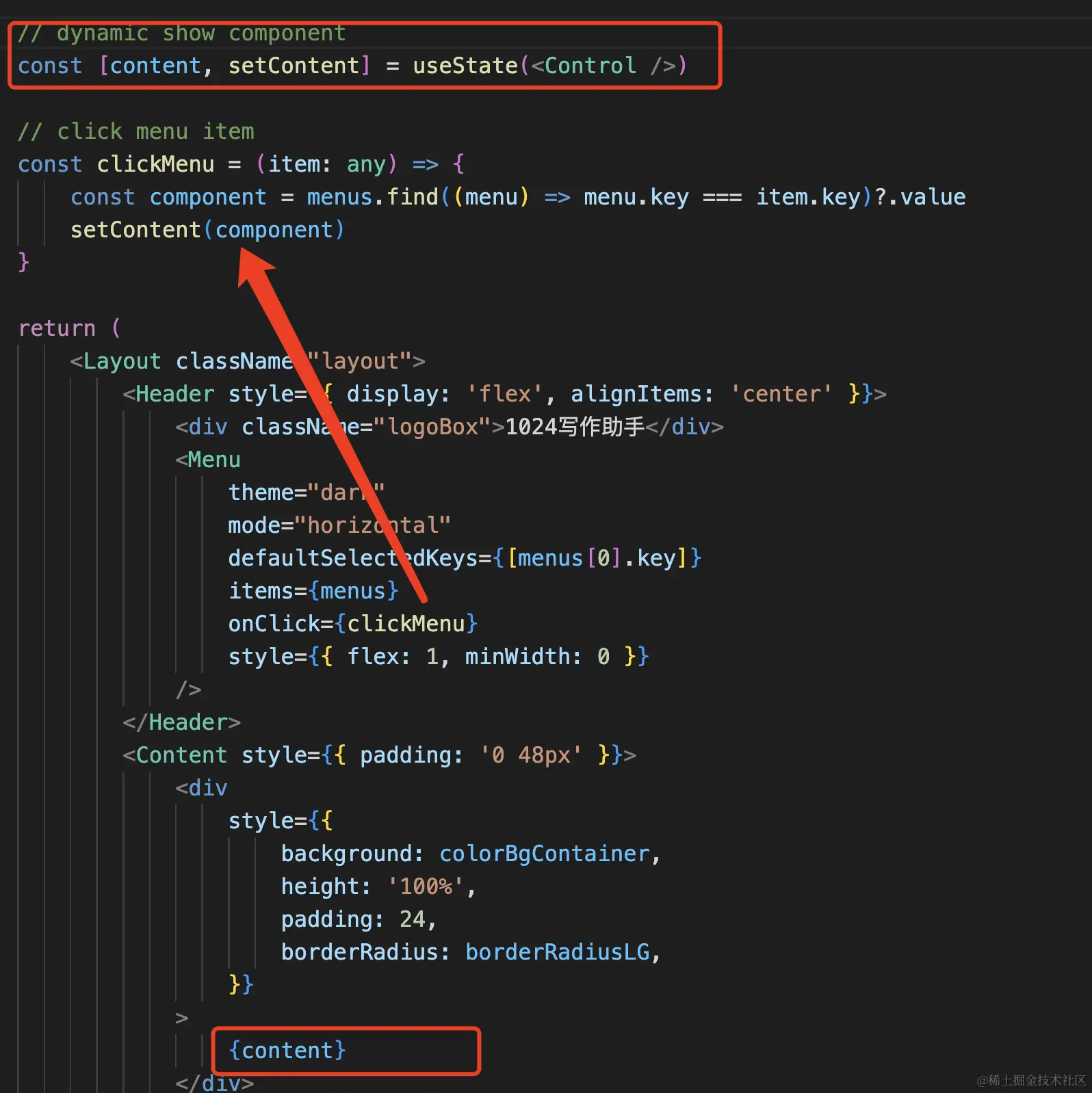当点击这个菜单的时候,动态修改content的值,然后将这个content渲染到页面上就可以了: