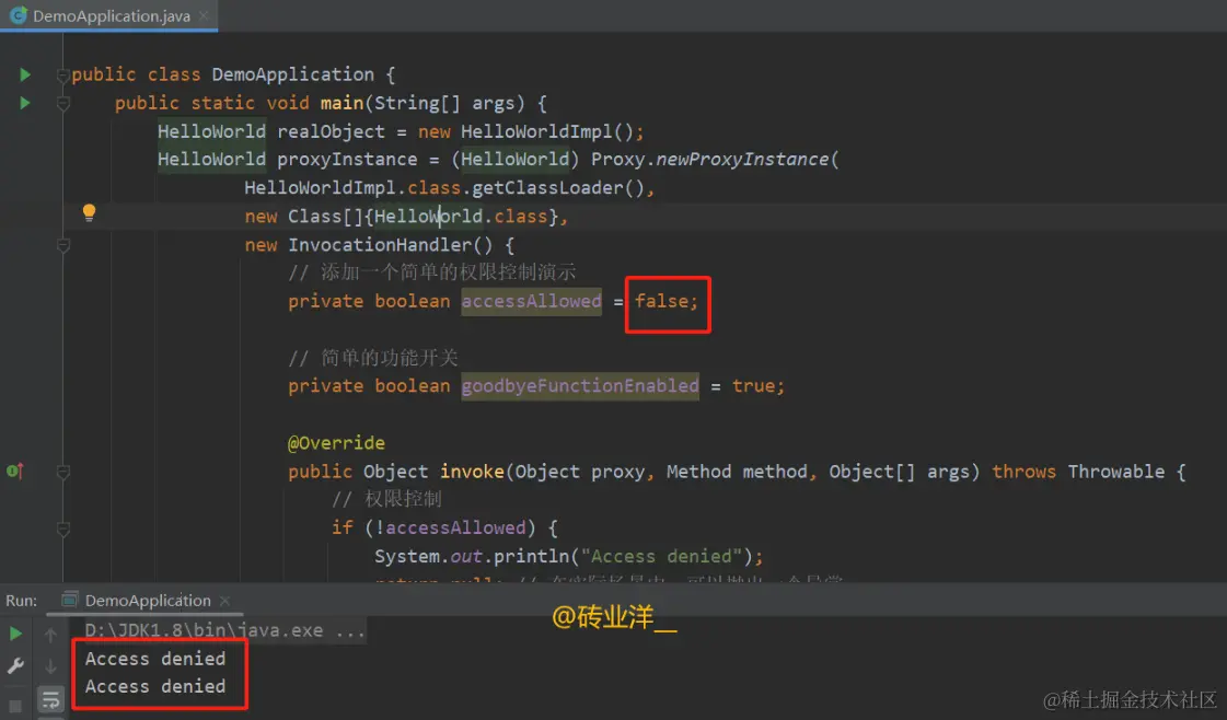 accessAllowed变量,我们可以模拟简单的权限控制。如果没有权限,可以直接返回或抛出异常,避免执行方法。 -