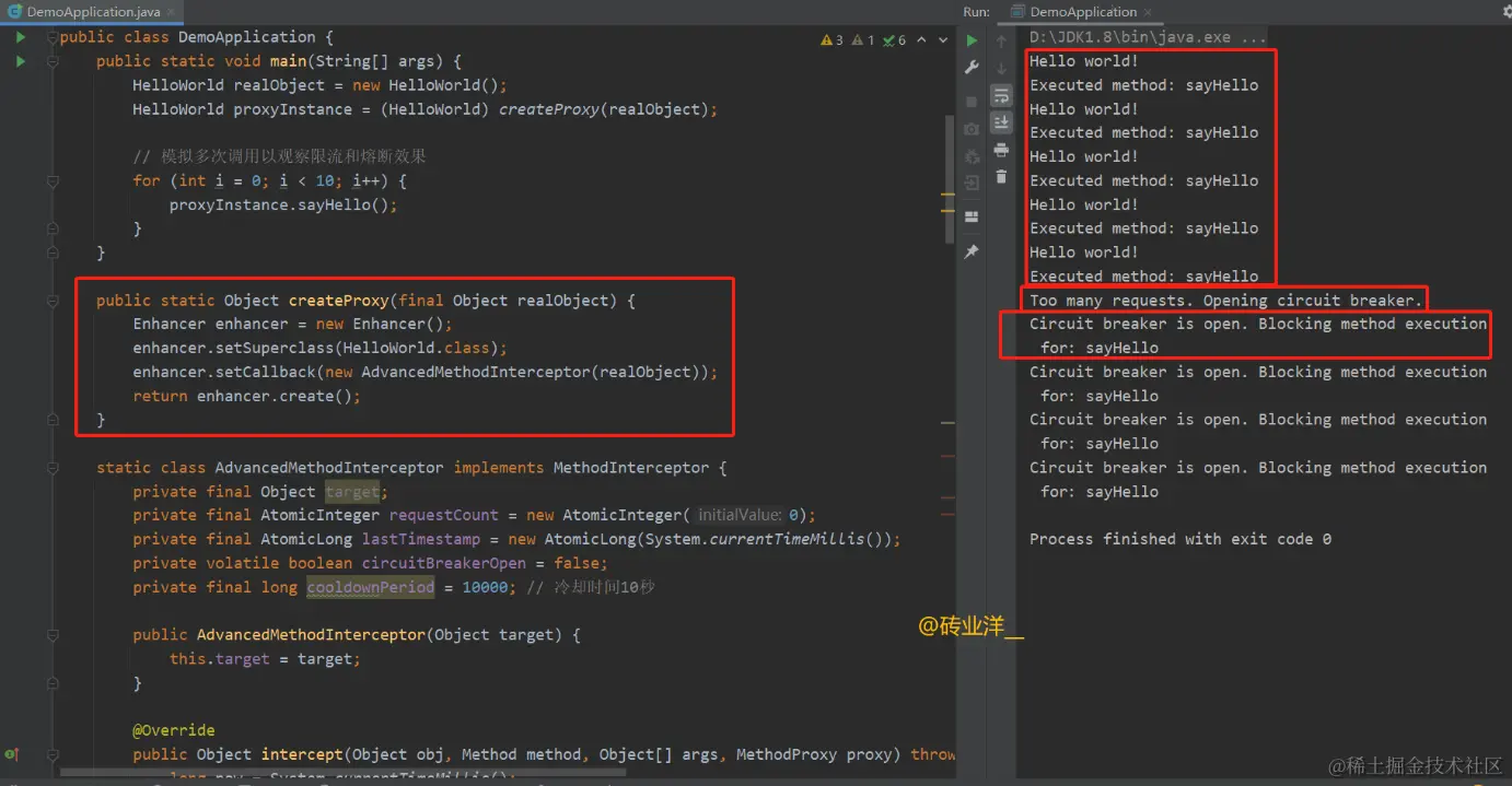 在这个改写中,我们使用CGLIB的Enhancer和MethodInterceptor来代替了JDK的Proxy和InvocationHandler。MethodInterceptor的intercept方法与InvocationHandler的invoke方法在概念上是相似的,但它使用MethodProxy的invokeSuper方法来调用原始类的方法,而不是使用反射。这允许CGLIB在运行时生成代理类的字节码,而不是依赖于反射,从而提高了性能。此外,circuitBreakerOpen被声明为volatile,是确保其在多线程环境中的可见性。