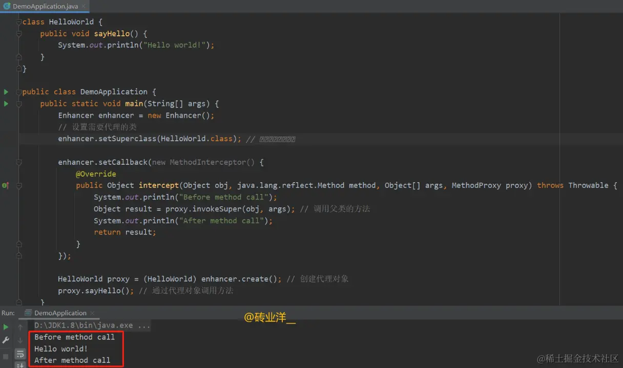HelloWorldImpl proxyInstance = (HelloWorldImpl) enhancer.create(); // 创建代理对象