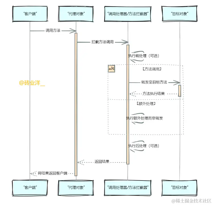 代理对象将方法调用转发给一个特定的处理器,这取决于所使用的代理类型。对于JDK动态代理,这个处理器是InvocationHandler;对于CGLIB代理,是MethodInterceptor。
