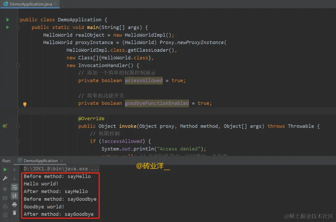 这个例子展示了JDK动态代理在实际应用中如何进行方法级别的细粒度控制,同时保持代码的灵活性和可维护性。通过动态代理,我们可以在不修改原始类代码的情况下,为对象动态地添加额外的行为。