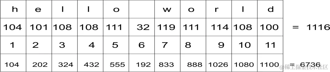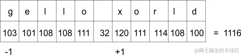 字符的序数值的总和对于字符串 gello xorld 也是相同的,因为 g 的序数值比 h 小 1,x 的序数值比 w 大 1,因此: