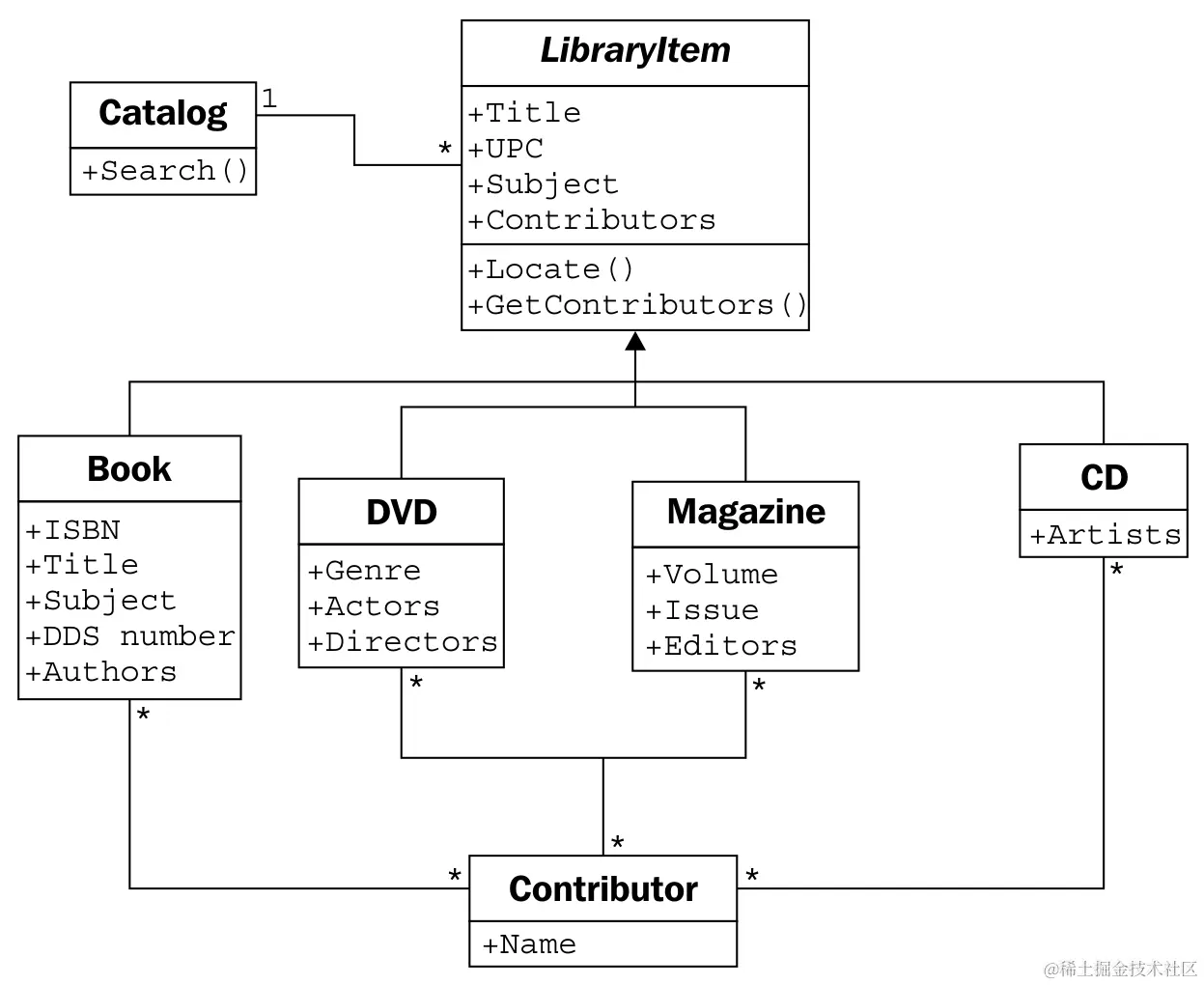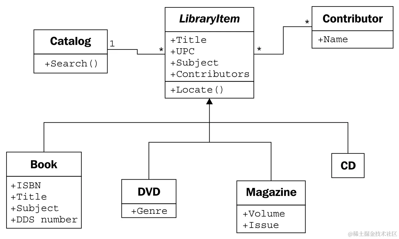 Contributor/LibraryItem关系的多重性是多对多,如一个关系两端的*****字符所示。任何一个图书馆项目可能有多个贡献者(例如,DVD 上的几位演员和一位导演)。许多作者写了很多书,所以他们可以附属于多个图书馆项目。