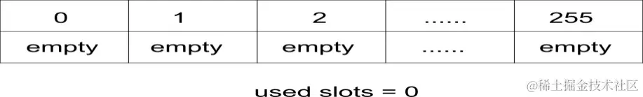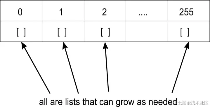 我们将哈希表的大小设置为 256 个元素。稍后,我们将研究如何在开始填充哈希表时扩展表的策略。现在,我们初始化一个包含 256 个元素的列表。这些元素通常被称为槽或桶。最后,我们添加一个计数器,用于记录实际哈希表元素的数量: