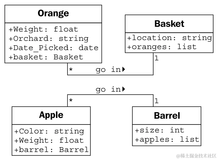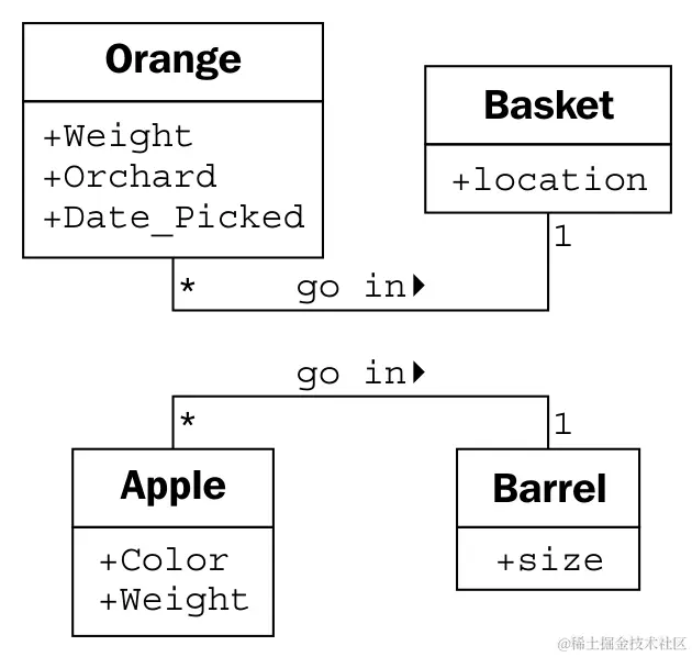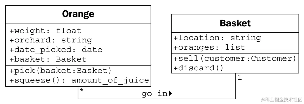 因此,采摘需要知道它正在处理的篮子是哪一个。我们通过给采摘方法一个篮子参数来实现这一点。由于我们的果农还销售果汁,我们可以在橙子类中添加一个挤方法。当调用时,挤方法可能会返回所取得的果汁量,同时将橙子从其所在的篮子中移除。