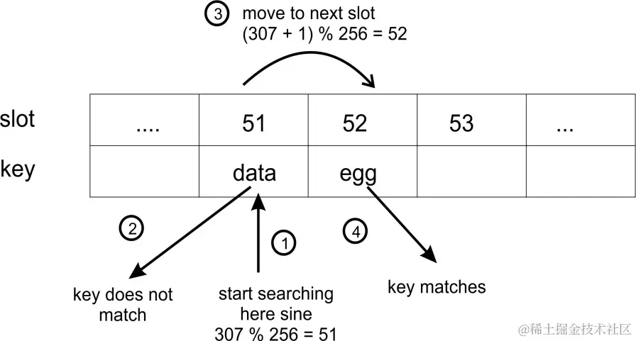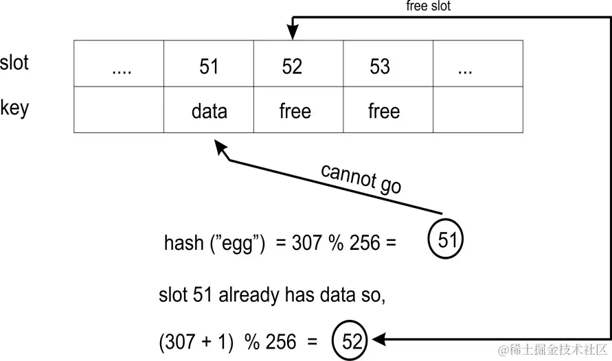 然而,如果槽不为空并且项目的键与我们当前的键不同,那么我们就会发生冲突。这就是我们需要想办法处理冲突的地方。我们将通过在先前的哈希值上加一,并取除以哈希表的大小的余数来解决这个问题。这是一种线性解决冲突的方法,非常简单: