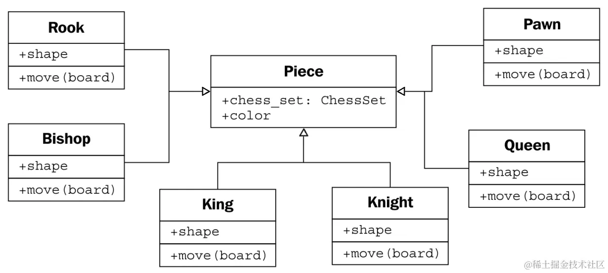 空心箭头表示各个棋子类从Piece类继承。所有子类都自动从基类继承chess_set和color属性。每个棋子提供一个不同的形状属性(在渲染棋盘时绘制在屏幕上),以及一个不同的move方法,以在每一轮中将棋子移动到棋盘上的新位置。