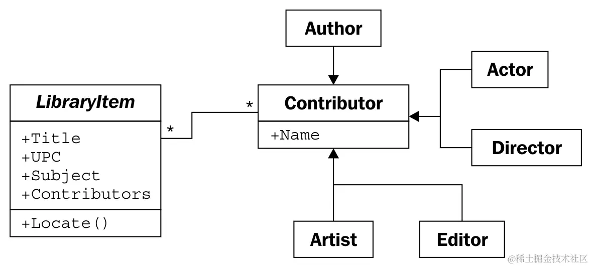 一个选择是向我们的LibraryItem子类中添加属性来保存我们需要的信息,比如Book上的Author,或者CD上的Artist,然后将这些属性的关系都指向Contributor类。问题在于,我们失去了很多多态的优雅。如果我们想列出项目的贡献者,我们必须寻找该项目上的特定属性,比如Authors或Actors。我们可以通过在LibraryItem类上添加一个GetContributors方法来解决这个问题,子类可以重写这个方法。然后目录永远不必知道对象正在查询的属性;我们已经抽象了公共接口: