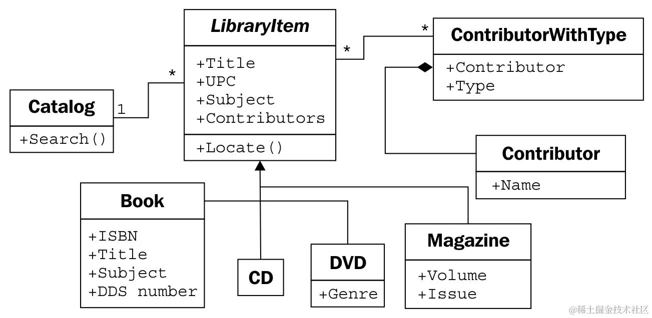 这个新类由一个贡献者和一个额外的属性组成,用于标识该人对给定LibraryItem所做贡献的类型。对于特定的LibraryItem可以有许多这样的贡献,一个贡献者可以以相同的方式为不同的项目做出贡献。以下的图表很好地传达了这个设计: