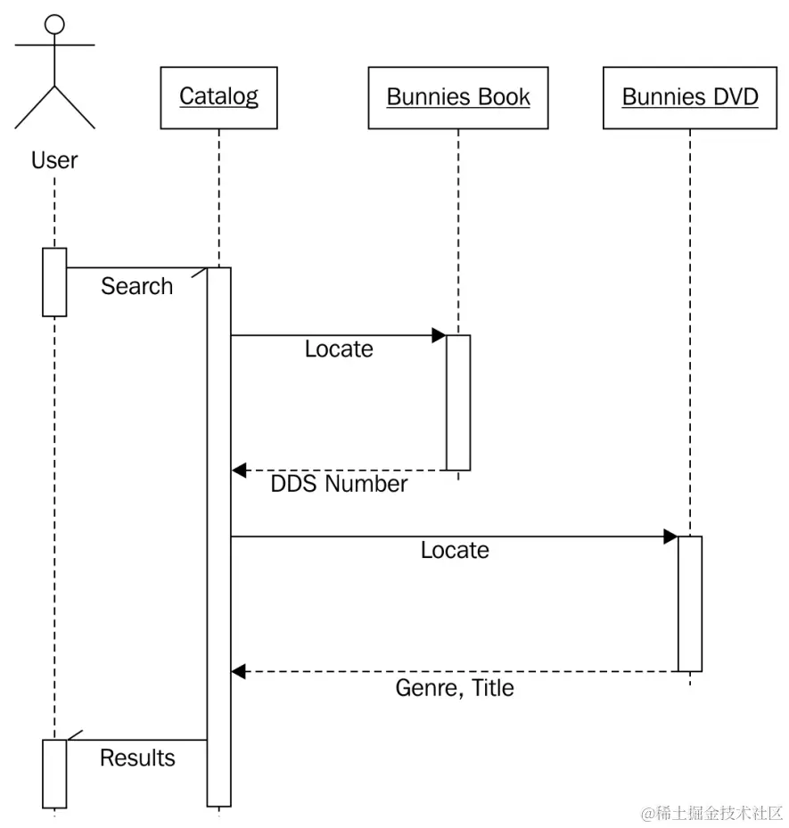 图书管理员理解了我们勾画的图表的要点,但对locate功能有点困惑。我们使用了一个特定的用例来解释,用户正在搜索单词bunnies。用户首先向目录发送搜索请求。目录查询其内部项目列表,找到了一个标题中带有bunnies的书和一个 DVD。此时,目录并不关心它是否持有 DVD、书、CD 还是杂志;在目录看来,所有项目都是一样的。然而,用户想知道如何找到这些实体项目,因此如果目录只返回一个标题列表,那就不够完善了。因此,它调用了两个发现的项目的locate方法。书的locate方法返回一个 DDS 号码,可以用来找到放置书的书架。DVD 通过返回 DVD 的流派和标题来定位。然后用户可以访问 DVD 部分,找到包含该流派的部分,并按标题排序找到特定的 DVD。