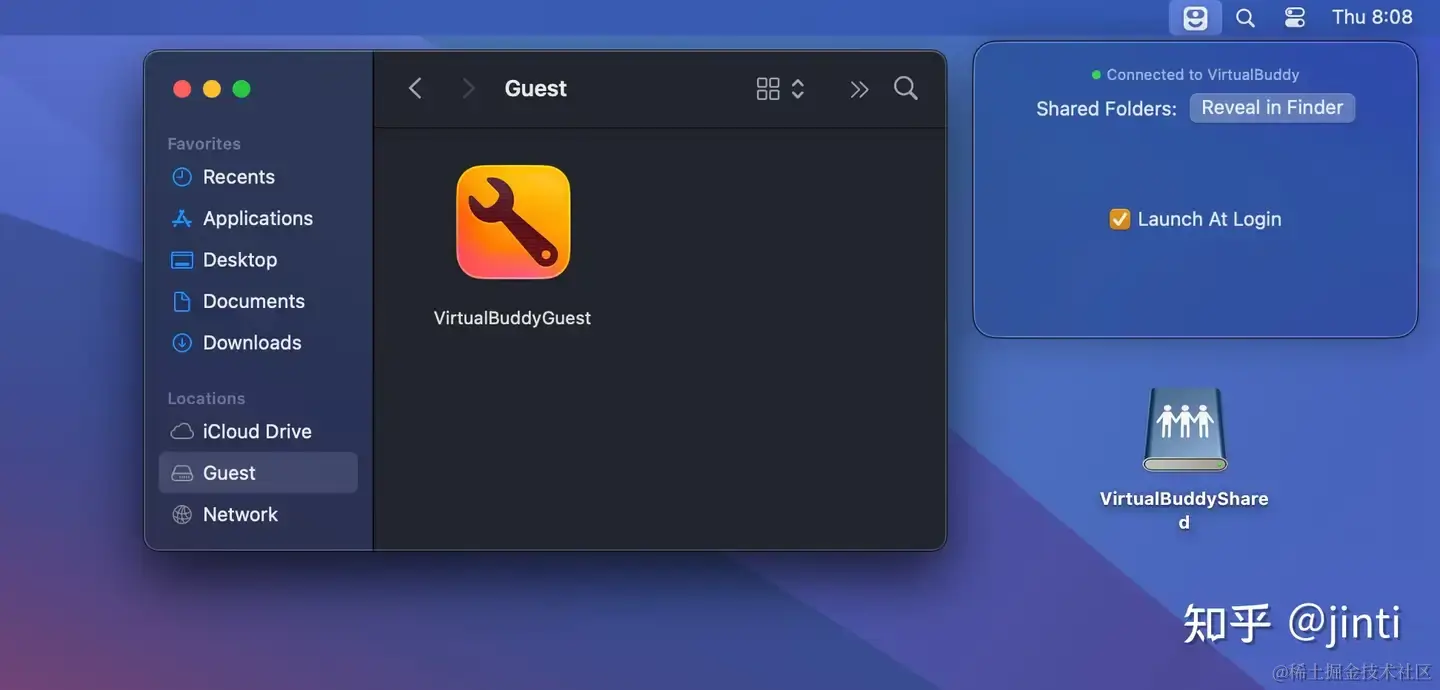 内置了一个GuestApp, 可以支持贡献剪贴板,共享文件等功能,虚拟机启动之后,只需在 Finder 的侧边栏上选择Guest磁盘,然后双击VirtualBuddyGuest应用程序图标。