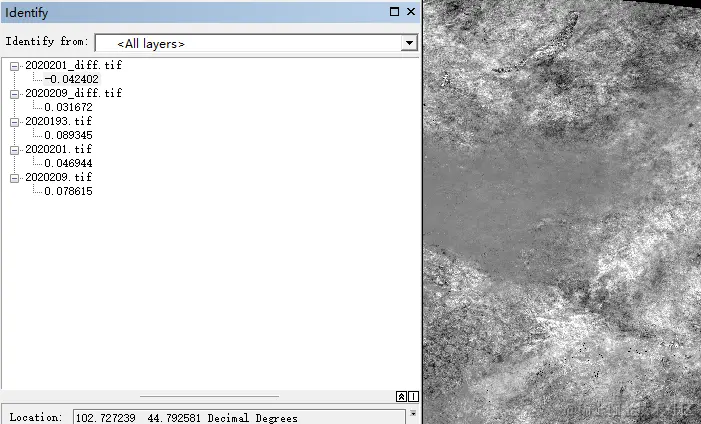 我们随机打开几景原始遥感影像,及其对应的差值结果文件;如下图所示,可以看到,我们差值结果文件中的像素,就是原始遥感影像文件之间像素的差值。