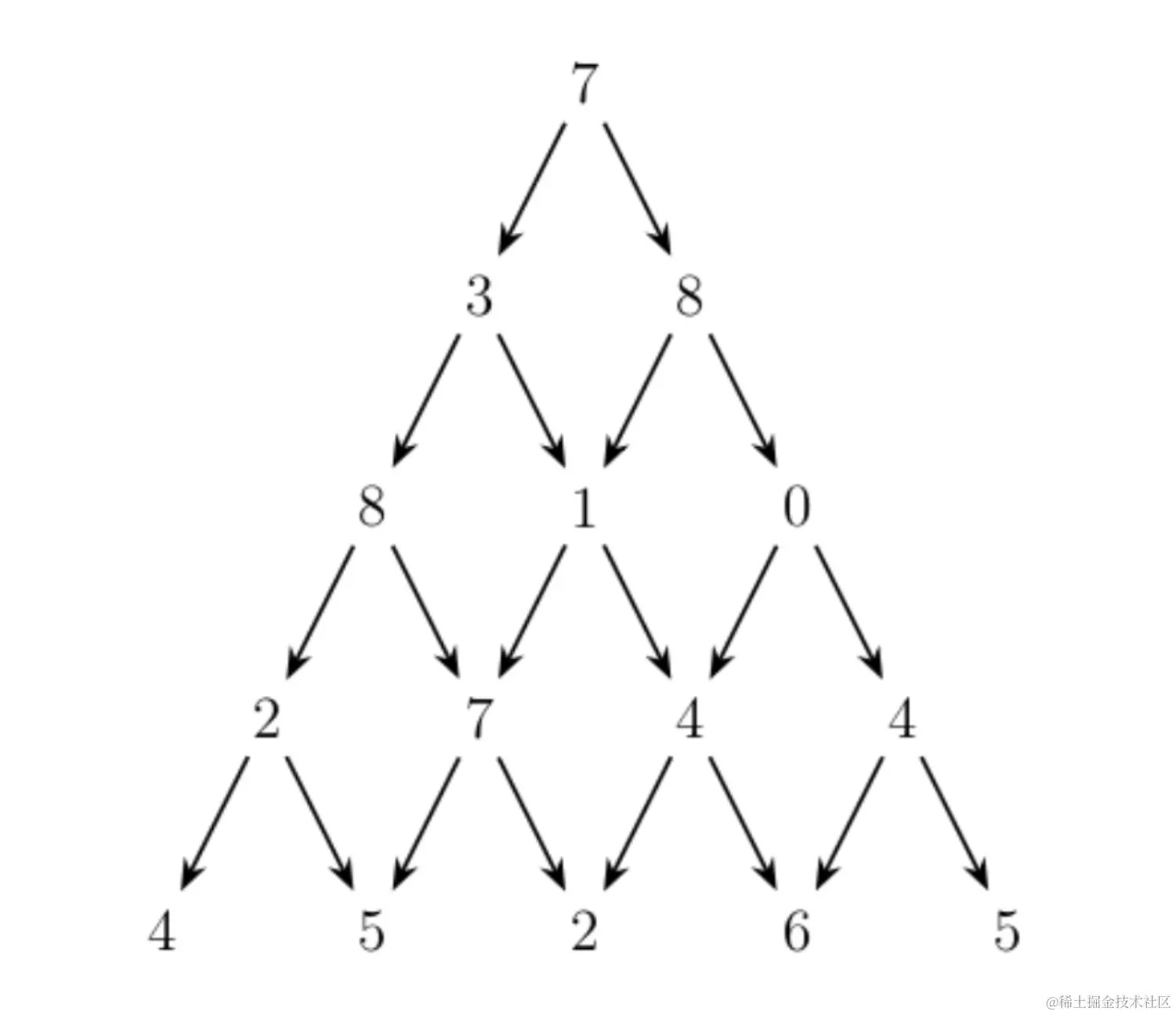 从三角形的顶部到底部有很多条不同的路径。对于每条路径,把路径上面的数加起来可以得到一个和,你的任务就是找到最大的和。路径上的每一步只能从一个数走到下一层和它最近的左边的那个数或者右 边的那个数。此外,向左下走的次数与向右下走的次数相差不能超过 1。