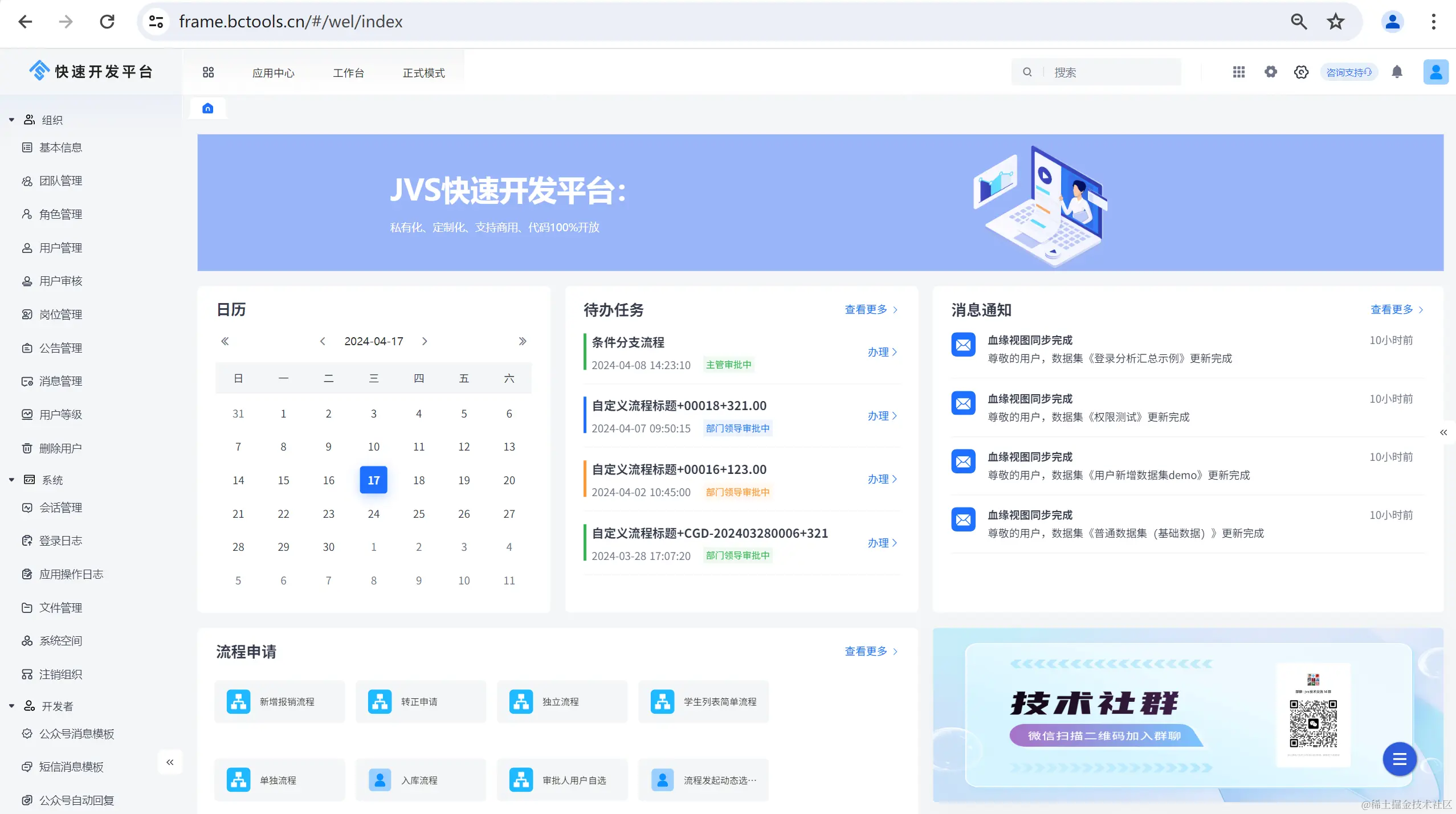 JVS是企业级数字化服务构建的基础脚手架,主要解决企业信息化项目交付难、实施效率低、开发成本高的问题,采用微服务+配置化的方式,提供了 低代码+数据分析+物联网的核心能力产品,并构建了协同办公、企业常用的管理工具等,所有的应用与能力采用模块化构建,按需开箱使用。