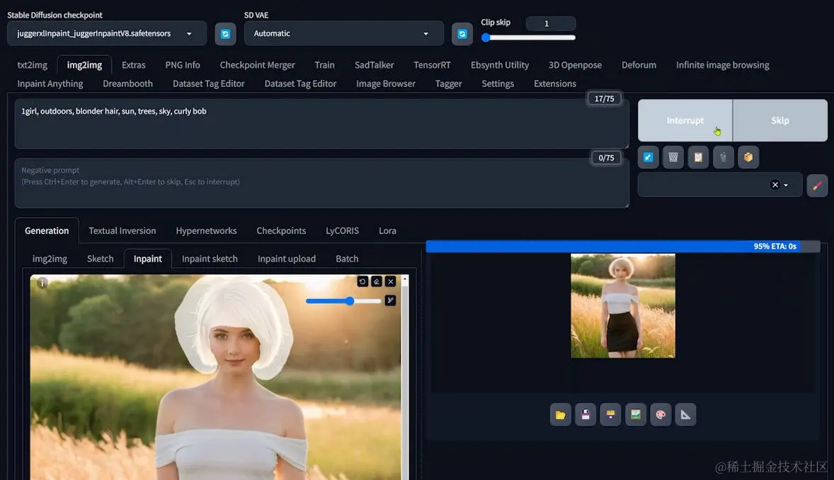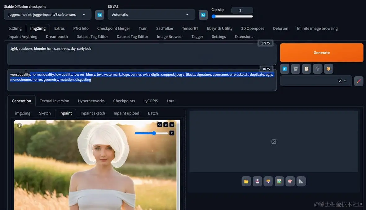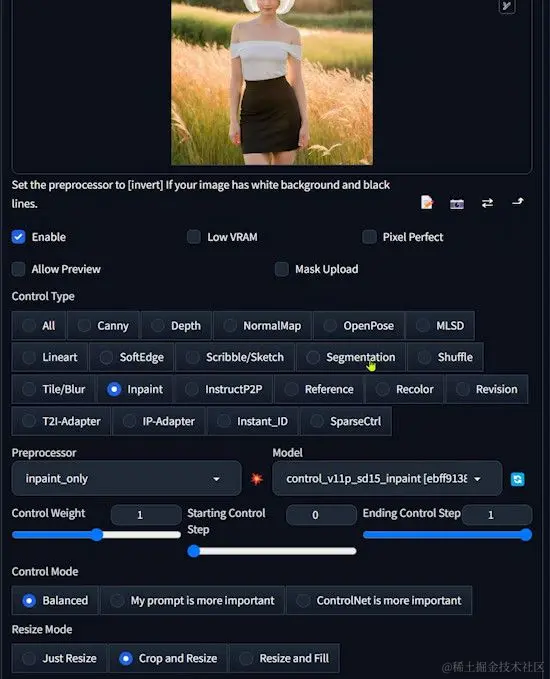juggerxlinpaint模型专门用于局部重绘,效果优于其他模型。- 虽然它无法与某些ControlNet功能结合,但可以通过第一种方法来补充。