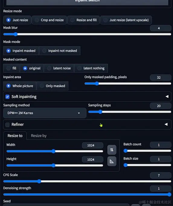 Soft Inpainting,确保过渡自然。如果你没有这个功能的话,记得要更新一下WebUI的版本。 - 设置重绘强度为1