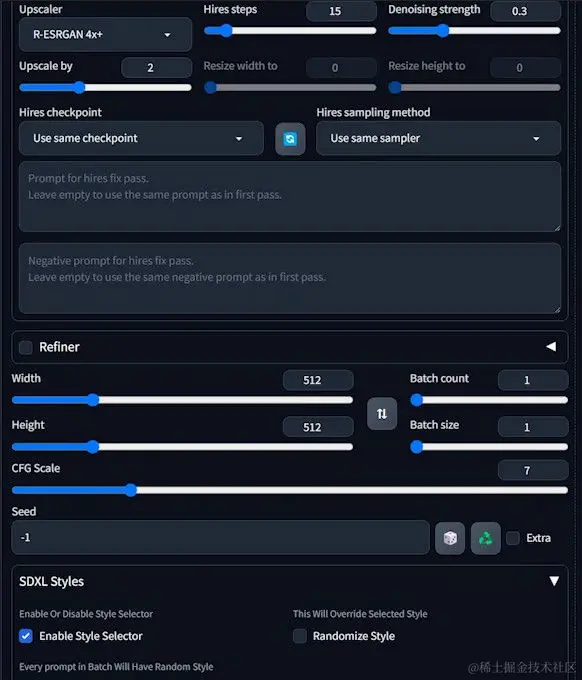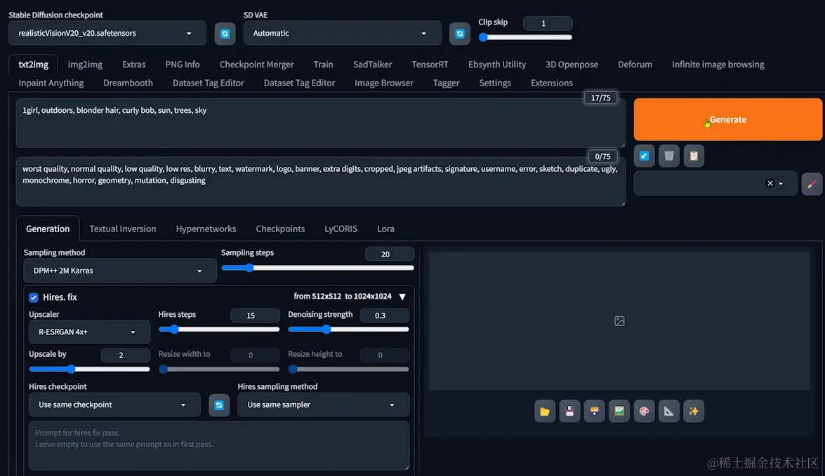 realisticVision模型,这是SD1.5版本的一部分,或者你也可以根据需要选择其他模型。 - 将尺寸设置为512x512(因为原图是1024x1024),然后使用高清修复功能将图片放大两倍,得到所需的尺寸。