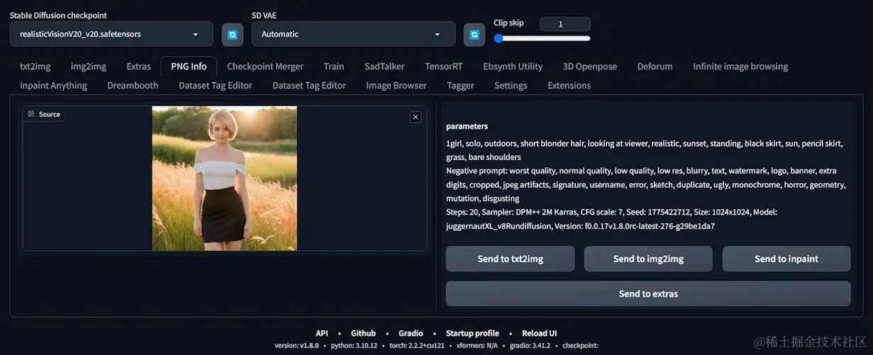 首先,让我们从文生图开始。假设我们已经有了一张图片(这里使用的是Stable Diffusion生成的)。这使得我们可以轻松地发送提示词进行图像生成或局部重绘。