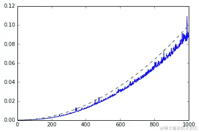 在下面的代码中,我们运行test2函数并绘制结果,以及适当缩放的n²函数进行比较,用虚线表示: