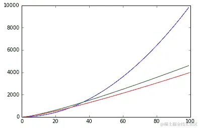 前面的图表显示了计算六次操作或七次操作的差异。我们可以看到这两种情况的分歧,这在谈论应用程序的具体情况时很重要。然而,我们在这里更感兴趣的是一种表征增长率的方法。我们不太关心绝对值,而是关心这些值随着n的增加而如何变化。通过这种方式,我们可以看到两条较低的曲线与顶部(x²)曲线相比具有相似的增长率。我们说这两条较低的曲线具有相同的复杂度类。这是一种理解和描述不同运行时行为的方法。我们将在下一节中正式化这个性能指标。