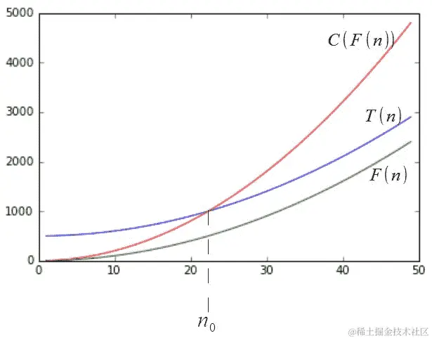 输入大小n的函数g(n)基于这样的观察:对于所有足够大的n值,g(n)都受到f(n)的常数倍的上界限制。目标是找到小于或等于f(n)的增长率最小的增长率。我们只关心在较高的n值发生的情况。变量n**0表示增长率不重要的阈值以下。函数T(n)表示紧密上界F(n)。在下图中,我们可以看到T(n) = n^(2) + 500 = O(n^(2)),其中C = 2,n[0]约为 23: