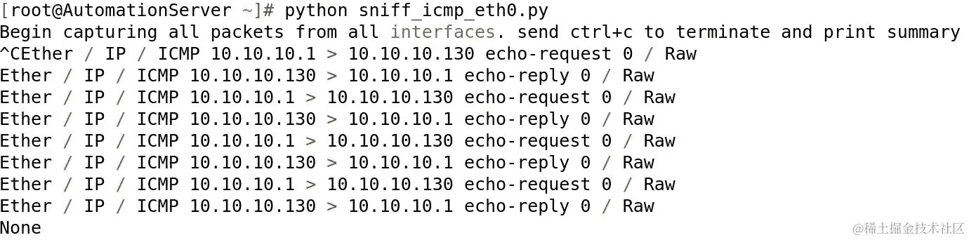 请注意,我们只捕获 eth0 接口上的 ICMP 通信,所有其他数据包都由于应用在它们上的过滤器而被丢弃。iface值接受我们在脚本中使用的单个接口或要监视它们的接口列表。