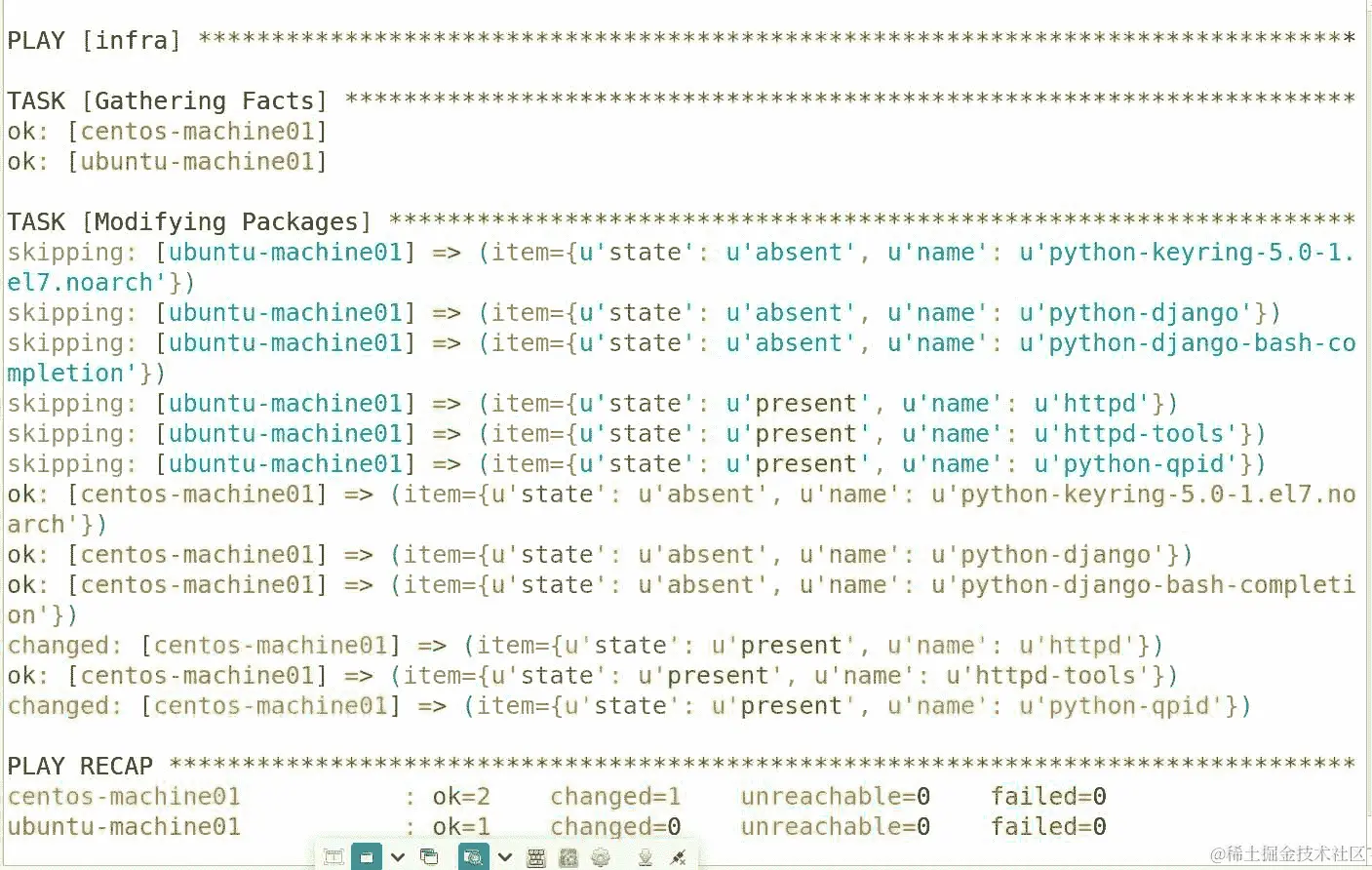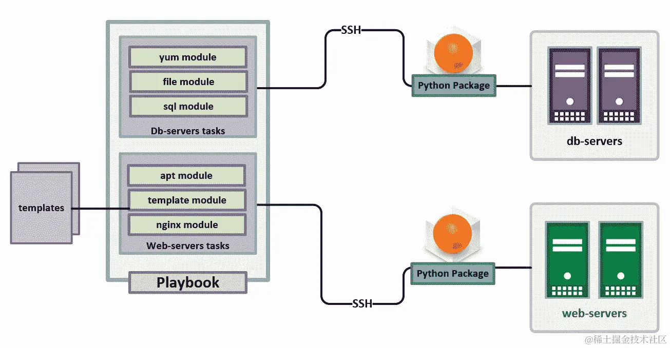 Ansible 基本上是用 Python 编写的,但它使用自己的 DSL(领域特定语言)。您可以使用此 DSL 编写,ansible 将在远程机器上将其转换为 Python 以执行任务。因此,它首先验证任务语法并从 Ansible 主机复制模块到远程服务器,然后在远程服务器上执行它。