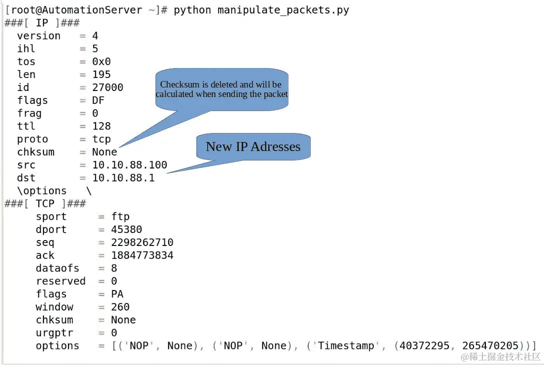 del关键字删除了 IP 和 TCP 校验和。Scapy 将根据新数据包内容重新计算它们。 -