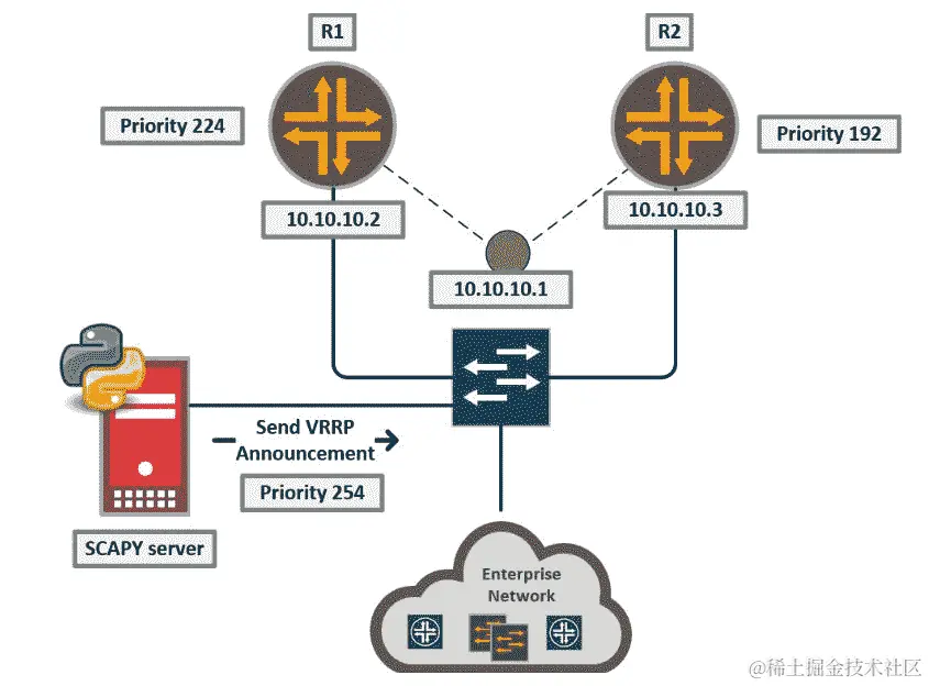 现在让我们做一些更复杂(和邪恶的)事情!假设我们有两台路由器之间形成 VRRP 关系,并且我们需要打破这种关系以成为新的主机,或者至少在网络中创建一个抖动问题,如下拓扑图所示: