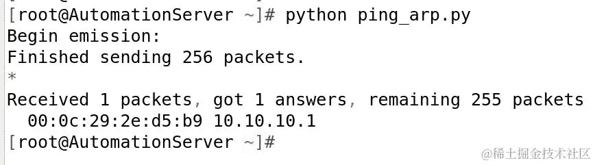 根据接收到的数据包,只有一个主机回复 SCAPY,这意味着它是扫描子网上唯一的主机。回复中列出了主机的 mac 地址和 IP 地址。
