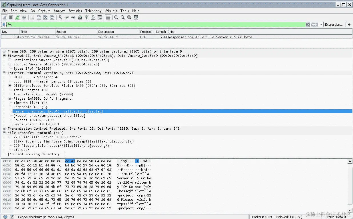 此外,如果我们仍然在网关上运行 Wireshark,我们会注意到 Wireshark 捕获了在重新计算后设置校验和值的ftp数据包流:
