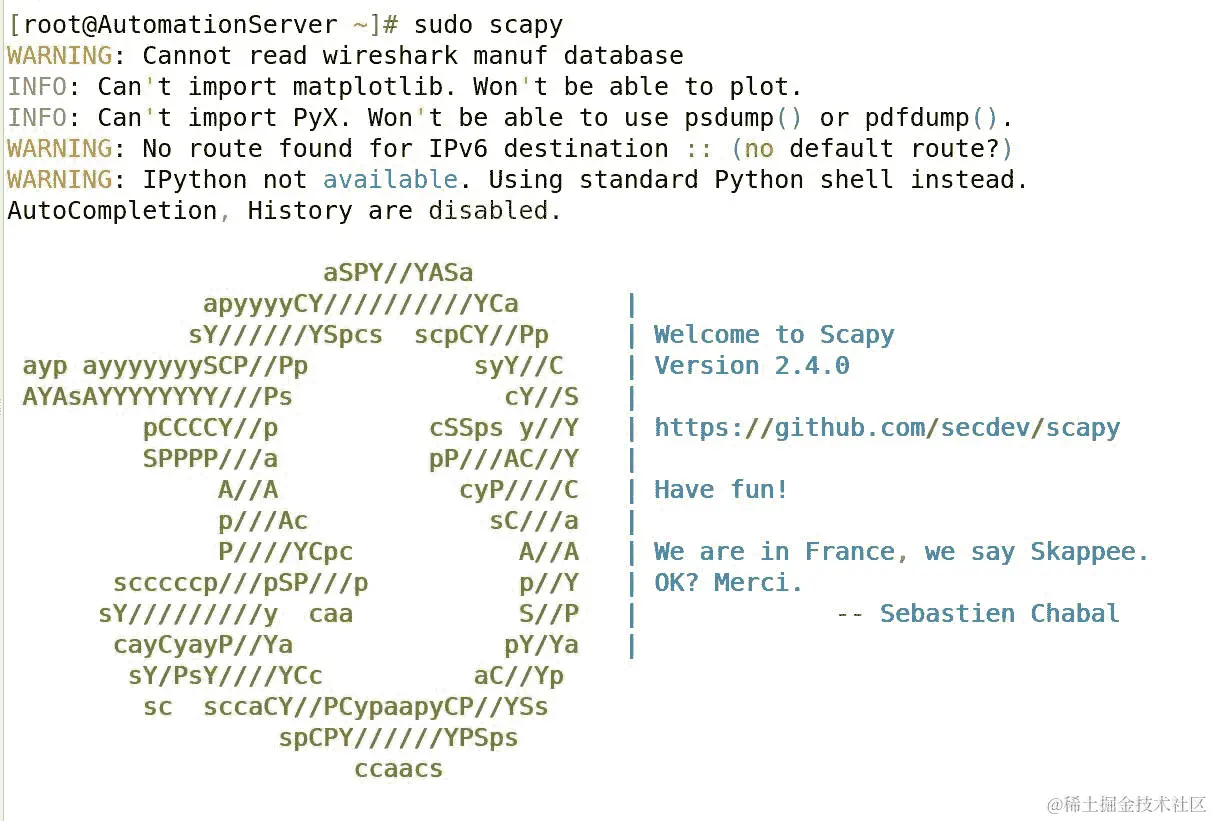 请注意,有一些关于一些缺少的可选软件包的警告消息,例如matplotlib和PyX,但这应该没问题,不会影响 Scapy 的核心功能。