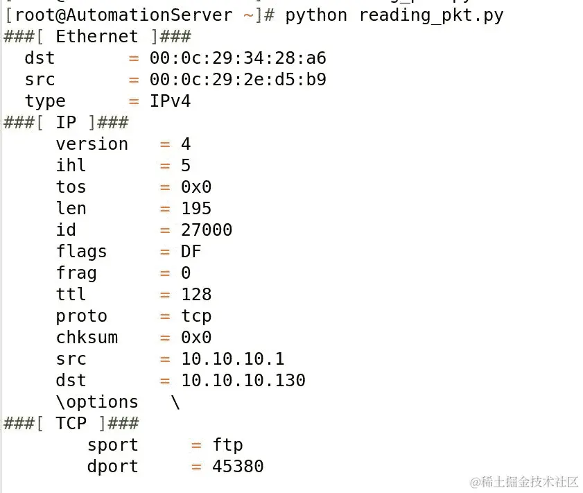 此外,您可以通过get_layer()函数获取特定层的信息,该函数访问数据包层。例如,如果我们有兴趣获取没有标头的原始数据,以便构建传输文件,我们可以使用以下脚本获取十六进制中所需的数据,然后稍后将其转换为 ASCII: