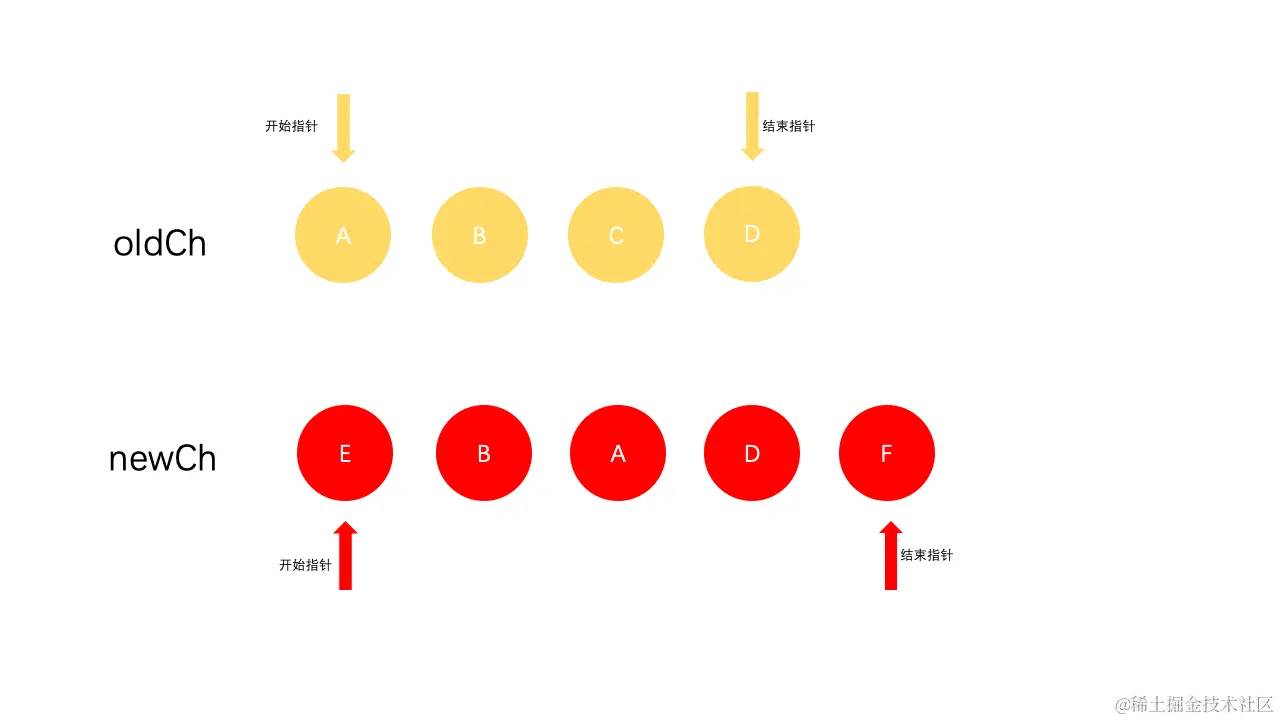 - oldStartVnode = oldEndVnode = D, newStartVnode = newEndVnode = F