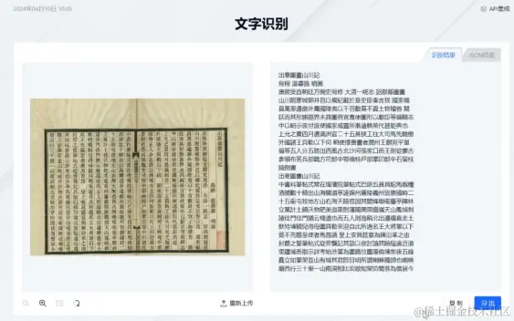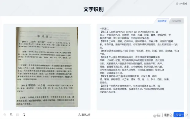 两张识别效果分别是温睿临著作《出塞图画山川记》和《医学三字经卷之一》的片段,可见几乎完美呈现全部内容,特别是生僻字词,准确度极高。