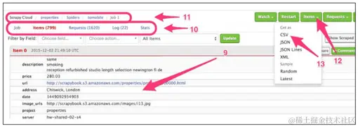 Feeds Feeds 可以让你导出用 Scrapy 抓取的数据到本地或到服务器。存储路径取决于 FEED_URI.FEED_URI,其中可能包括参数。例如 scrapy crawl fast -o "%(name)s_%(time)s.jl,可以自动将时间和名字填入到输出文件。如果你需要你个自定义参数,例如%(foo)s, feed 输出器希望在爬虫中提供一个叫做 foo 的属性。数据的存储,例如 S3、FTP 或本地,也是在 URI 中定义。例如,FEED_URI='s3://mybucket/file.json'可以使用你的 Amazon 证书(AWS_ACCESS_KEY_ID 和 AWS_SECRET_ACCESS_KEY),将你的文件存储到 Amazon S3。存储的格式,JSON、JSON Lines、CSV 和 XML,取决于 FEED_FORMAT。如果没有指定的话,Scrapy 会根据 FEED_URI 的后缀猜测。你可以选择输出为空,通过设定 FEED_STORE_EMPTY 为 True。你还可以选择输出指定字段,通过设定 FEED_EXPORT_FIELDS。这对.csv 文件特别有用,可以固定 header 的列数。最后 FEED_URI_PARAMS 用于定义一个函数,对传递给 FEED_URI 的参数进行后处理。