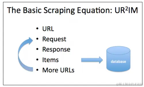 UR2IM——基础抓取过程 每个网站都是不同的,对每个网站进行额外的研究不可避免,碰到特别生僻的问题,也许还要用 Scrapy 的邮件列表咨询。寻求解答,去哪里找、怎么找,前提是要熟悉整个过程和相关术语。Scrapy 的基本过程,可以写成字母缩略语 UR2IM,见下图。