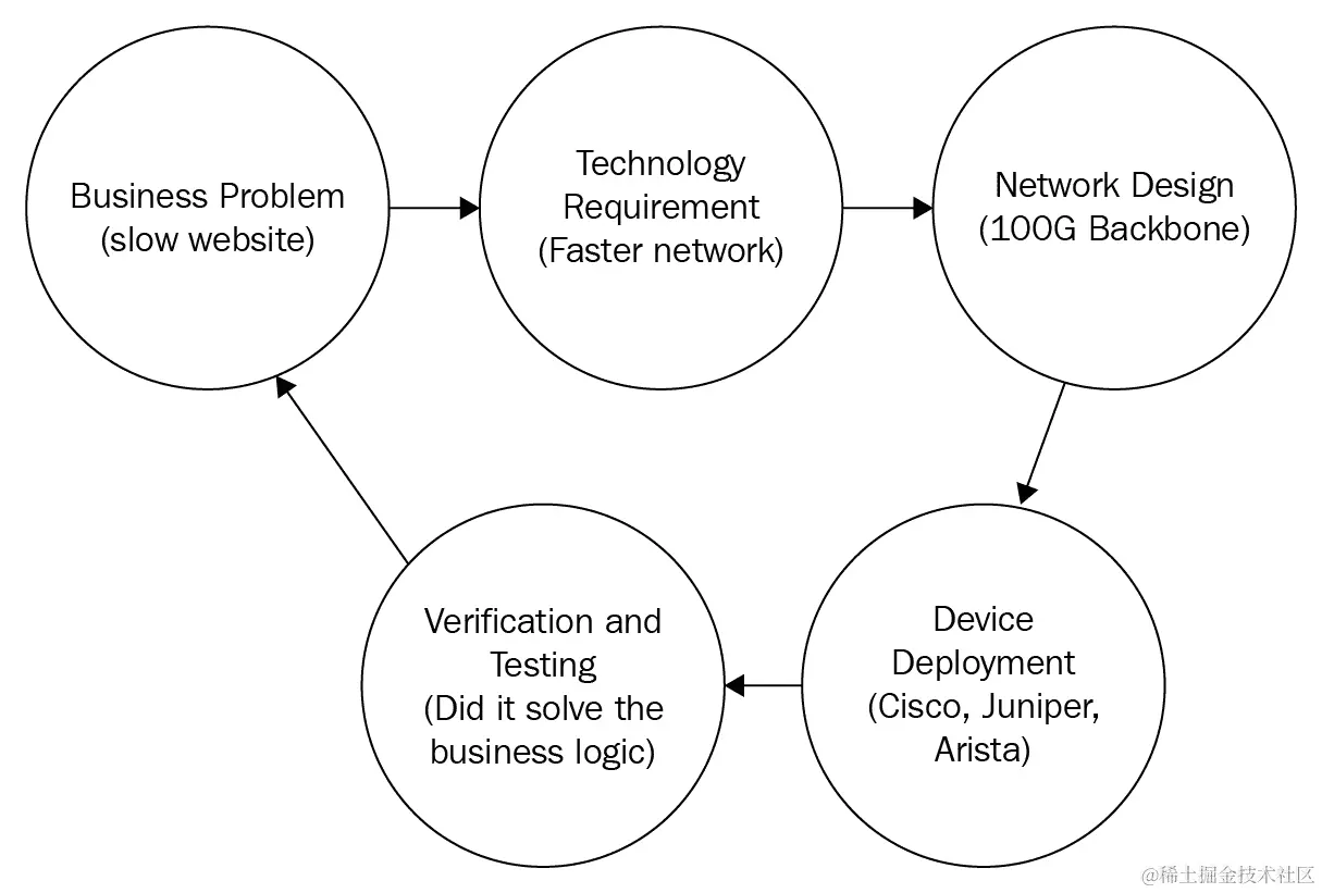 让我们更深入地探讨将我们的意图转化为网络需求的想法。如果你曾经从事过网络设计,那么最具挑战性的部分往往不是网络设备的不同部分,而是资格和将业务需求转化为实际网络设计。你的网络设计需要解决业务问题。例如,你可能在一个更大的基础设施团队中工作,需要适应一个繁荣的在线电子商务网站,在高峰时段经历网站响应速度缓慢。你如何确定网络是否存在问题?如果网站的响应速度确实是由于网络拥塞造成的,那么你应该升级网络的哪一部分?其他系统能否利用更大的速度和吞吐量?以下图表是一个简单的过程的示意图,当我们试图将我们的业务需求转化为网络设计时,我们可能会经历的步骤: